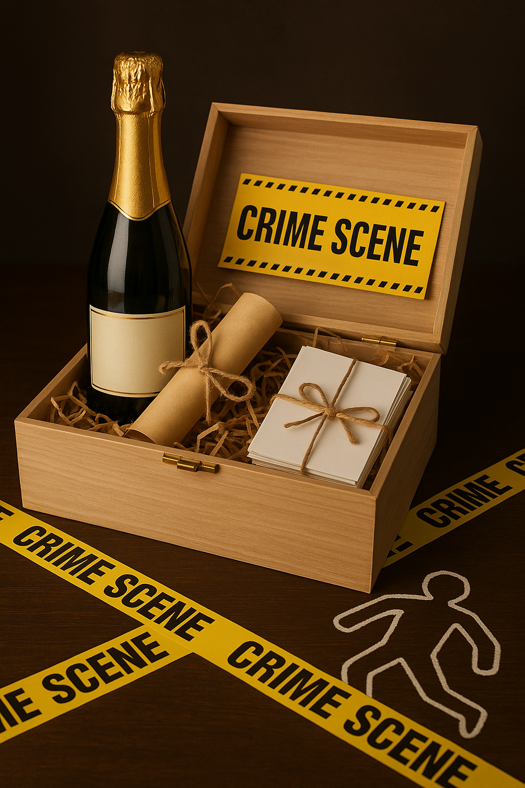 Diese Überraschungsbox verwandelt Ihr Wohnzimmer in einen Tatort und Ihre Gäste in Verdächtige. Alles, was Sie brauchen: ein paar Mitspieler*innen, ein bisschen Fantasie – und diese Box.